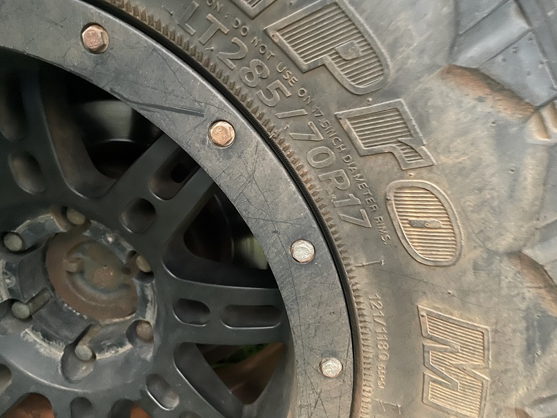 Anyway, it arrived, and I compared it with the existing ones. I expected the new one to be nice and shiny against the old ones, but I had no idea how rusty the false bead lock nuts had become, it looked like a different wheel.
